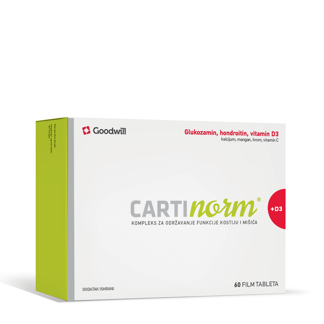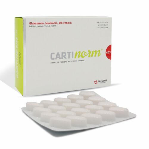 Cartinorm®+D3 je hrana za posebne medicinske namene koja sarži vitamin D3 i vitamin C, kalcijum, mangan, hrom, glukozamin i hondroitin sulfat. Namenjena za posebne nutritivne potrebe kod poremećaja u zglobovima izazvanih nepovoljnim stanjem kostiju i mišića kojima je neophodna dodatna potpora specifičnih vitamina i minerala.