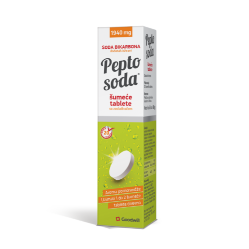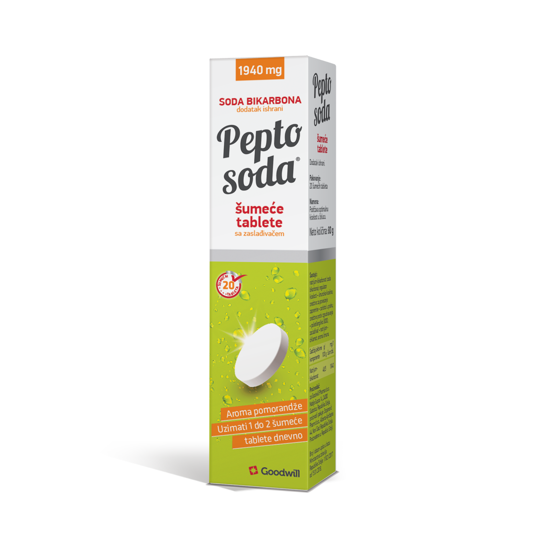 Pepto Soda Pomorandža je jedinstveni dodatak ishrani u vidu šumećih tableta čiji je aktivni sastojak soda bikarbona i koristi se za neutralisanje hlorovodonične kiseline u želucu. Pepto Soda doprinosi smanjenju gorušice, otklanjanju tegoba koje prate prekomerno lučenje želudačne kiseline.