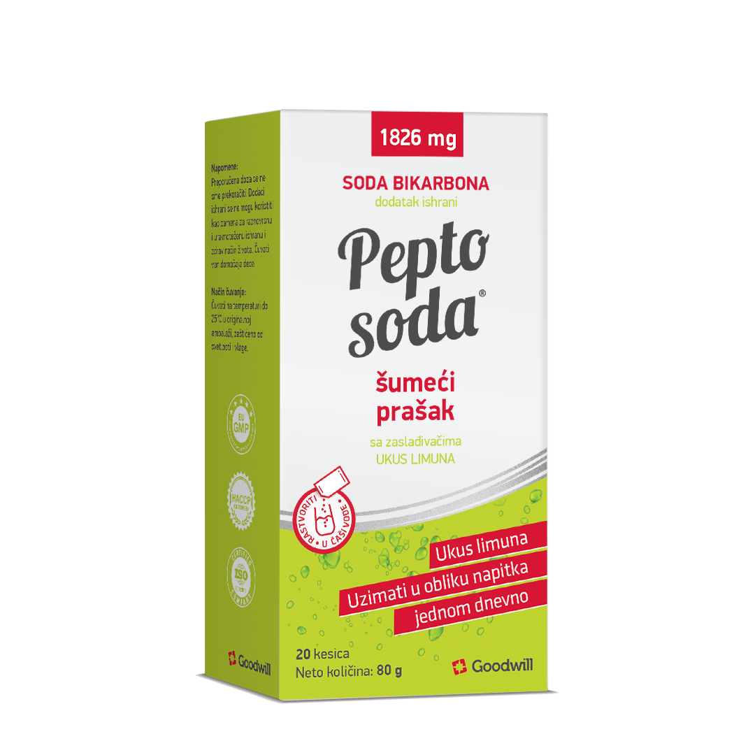 Pepto Soda je jedinstveni dodatak ishrani u vidu šumećeg praška čiji je aktivni sastojak soda bikarbona i koristi se za neutralisanje hlorovodonične kiseline u želucu. Pepto Soda doprinosi smanjenju gorušice, otklanjanju bola i drugih tegoba koji prate prekomerno lučenje želudačne kiseline.